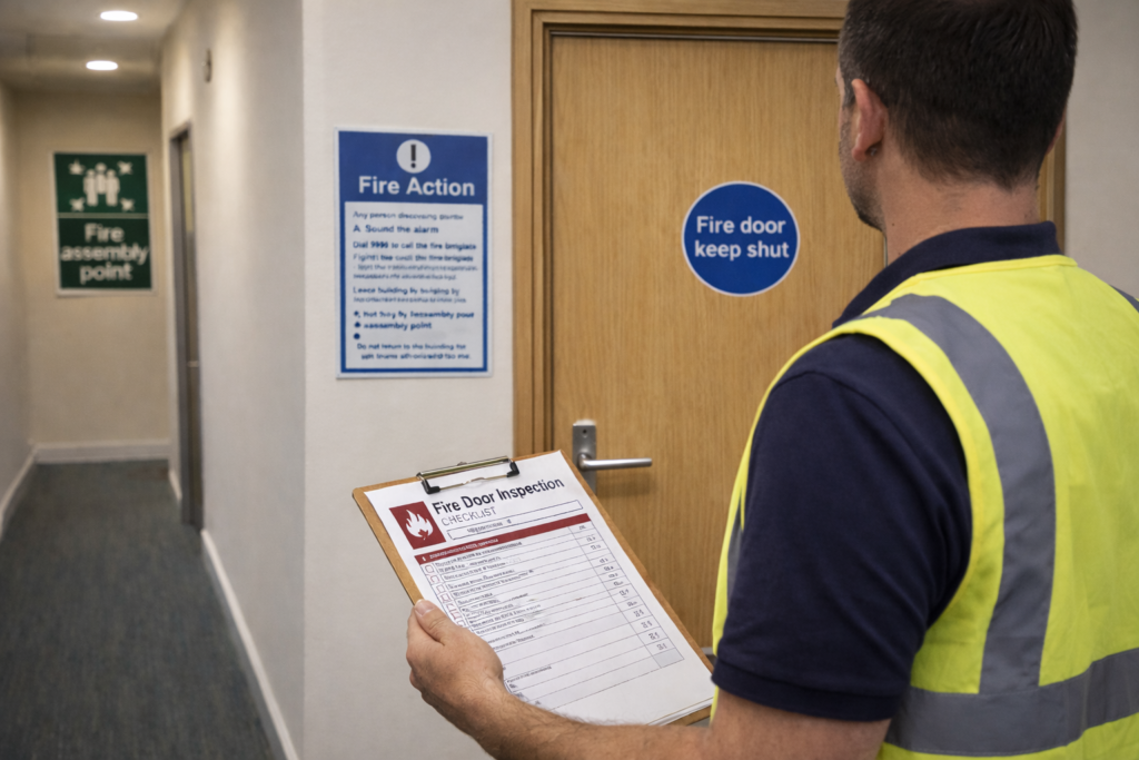 Fire door labels, fire action notices and assembly point signs to clearly mark safety routes and responsibilities